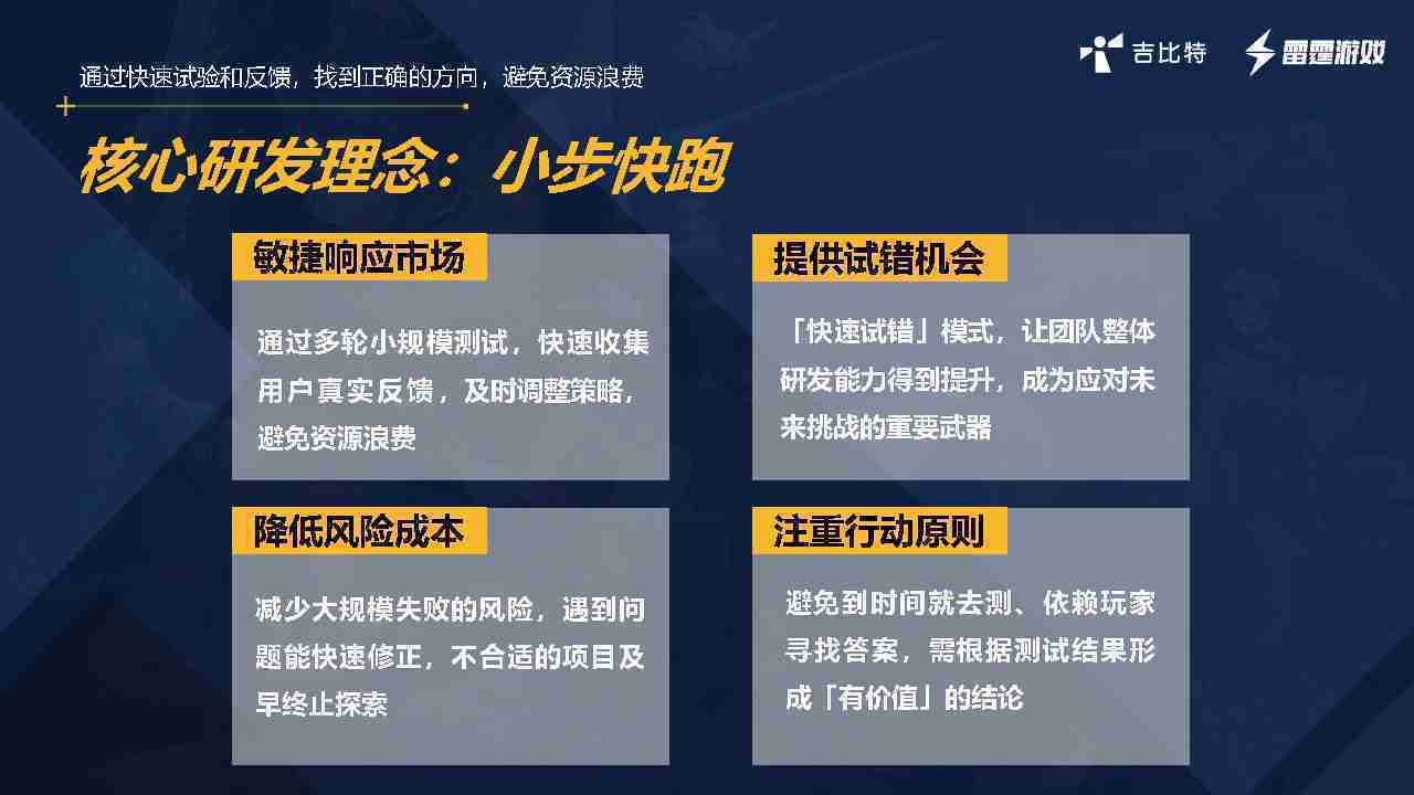 从目前的实践来看,,,,内容向确实不合适,,,,因为小步快跑更适合做玩法的尝试,,,但是如果是内容项,,,,玩法已经确定的,,,这时候应该做切片,,,而不是做小步快跑的方式,,,,因为做切片的成本是很高的。。我们有过两个项目,,,,要花很长时间做切片的内容,,而切片内容只占整个项目的1/10,,,但要花的时间成本、、、人力成本、、、经济成本可能会到1/3,,所以用很短的时间做游戏的原型,,,,验证其好不好玩,,是想尝试在粗糙表达的情况下,,,,看看能否获得非常好的留存表现。。。如果留存表现非常好,,证明游戏内容体验是比较准确和非常好的内核,,,,我们会尝试加外围内容的拓展。。。