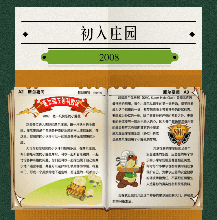 在这一年,,摩尔庄园诞生了。。。在这里,,大家都是可爱的红鼻子鼹鼠小摩尔,,,,可以一起勤劳耕作,,,一起高山滑雪......我们都是摩尔庄园的建设者。。。