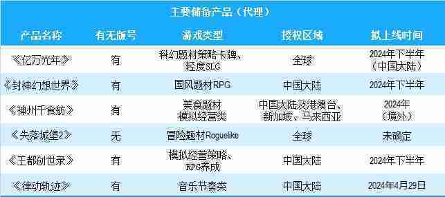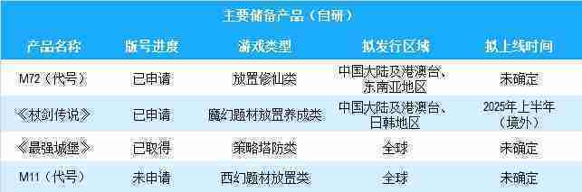 公司有多款储备产品,,,涵盖放置类、、策略类、、RPG、、、Roguelike等多元化游戏品类,,,储备的主要自研和代理产品如下:::