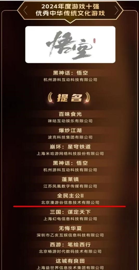 在2024年度备受瞩目的游戏界盛会上,,,,年度“游戏十强”榜单终于揭晓。。经过一系列激烈的竞争和严格的评审流程,,,,公司产品《全民主公II》凭借其卓越的游戏品质和庞大的玩家基础,,荣获“2024优秀中华传统文化游戏”提名。。。。此奖项被誉为“第九艺术封神榜”,,因其突出的影响力、、公信力成为中国游戏产业最高奖项。。。