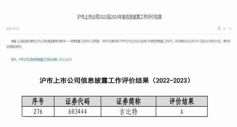 近日,,上海证券交易所发布2022-2023年度信息披露工作评价结果。。1win(股票代码::603444)凭借规范的公司治理、、、高质量的信息披露以及良好的投资者关系管理再次荣获信息披露工作A级评价,,,公司连续两年获此殊荣。。。
